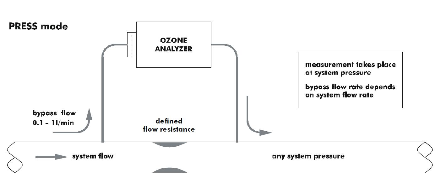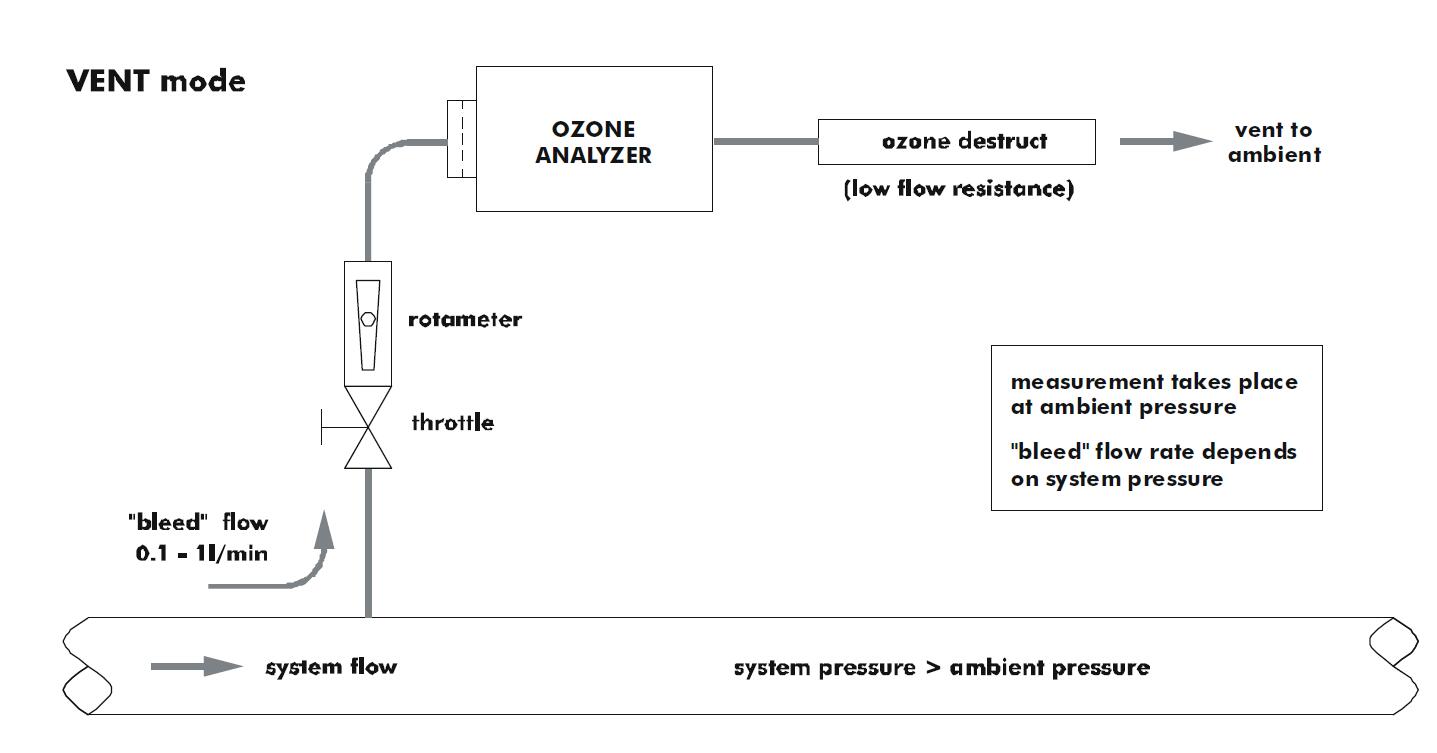 當系統流量較大時,e。G在每分鐘1到10升之間, 很好的解決方案是將臭氧分析儀在旁路連接到臭氧線中的一個小流阻。這個流動阻力下的壓降應該在幾毫升棒的順序,以允許足夠的樣品氣體流過分析儀。