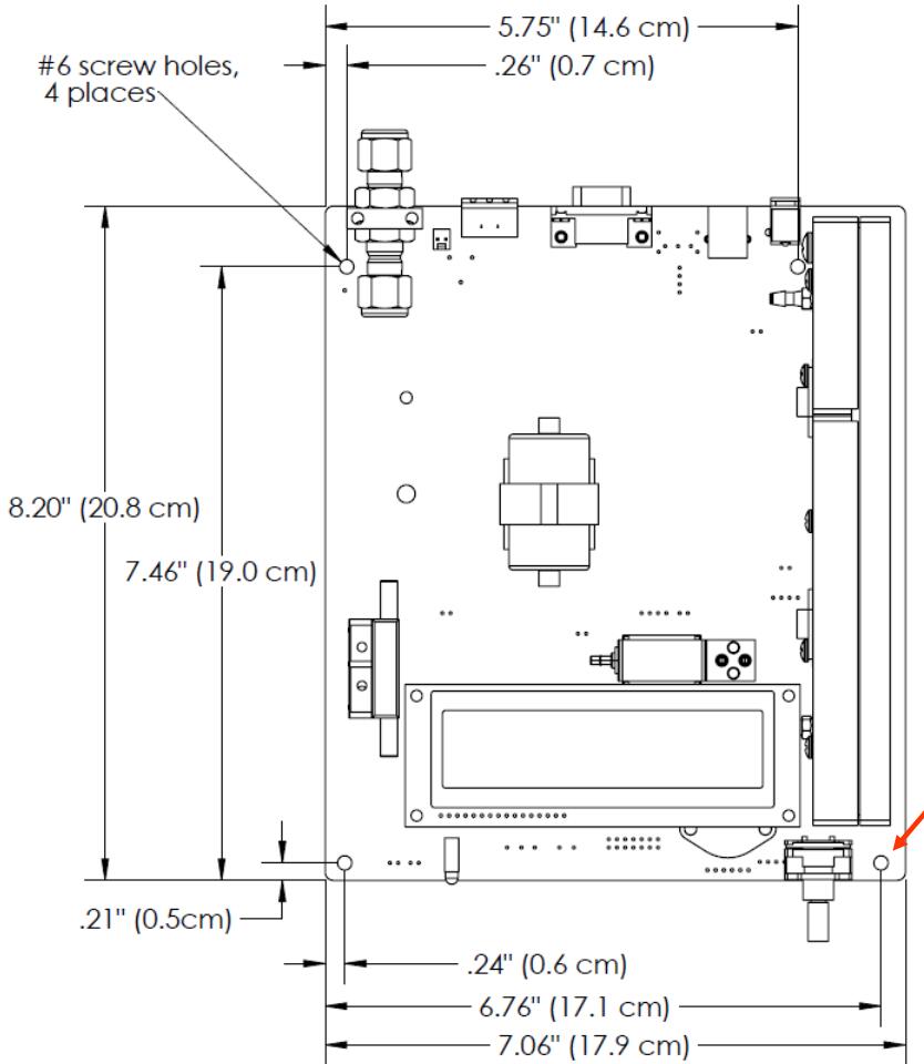 電路板有四個(gè)孔,用于將臭氧監(jiān)測(cè)儀安裝到儀器下方的支架上(圖 1)。 這些孔用于#6 機(jī)器尺寸螺釘。 如果安裝到未接地的物體上,請(qǐng)使用絕緣螺釘和墊圈來安裝儀器,否則使用不銹鋼螺釘和墊圈固定三個(gè)孔,并在選擇開關(guān)的孔上使用塑料墊圈(見下文)。